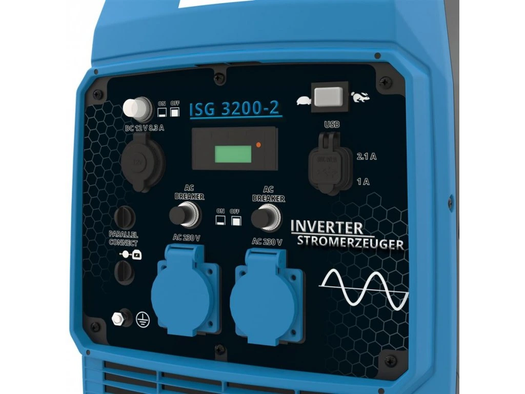 Trvalý (pracovní) výkon generátoru: 3.200 W • 2 x zásuvka 230 V~, 1 x výstup 12 V=, 2 x USB port (1 A - 2,1 A).