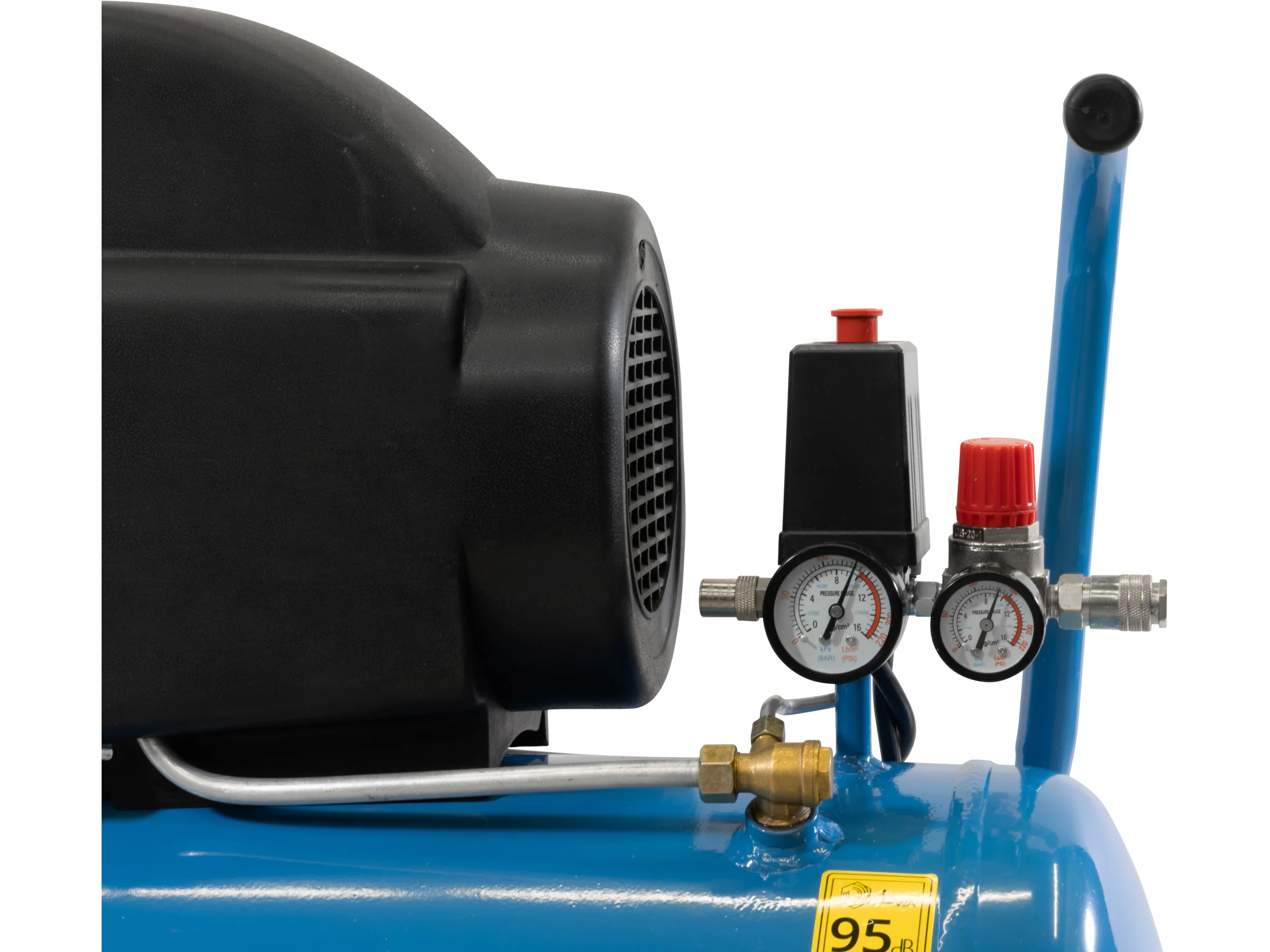 Je také vybaven tlakoměrem v nádrži a pracovním tlakoměrem, dvěma pneumatickými spojkami, vypouštěcí zátkou kondenzátu a praktickou rukojetí pro přenášení.