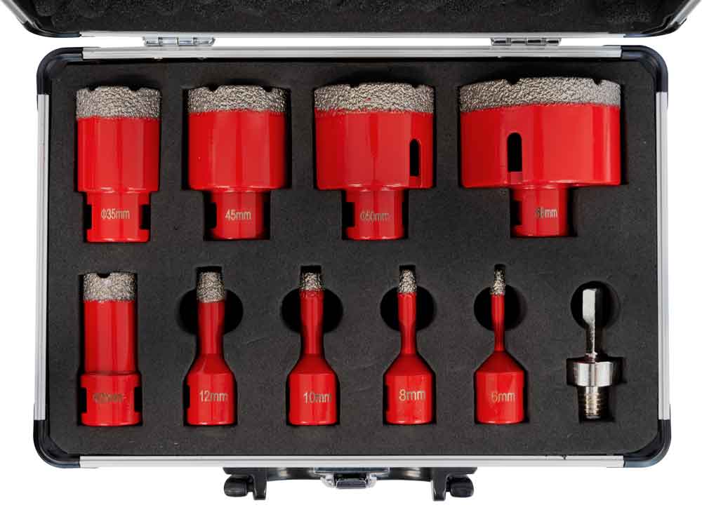 10-dílná sada diamantových suchých jádrových vrtáků se skládá z 9 jádrových vrtáků a adaptéru sklíčidla M14 na čtyřhran.