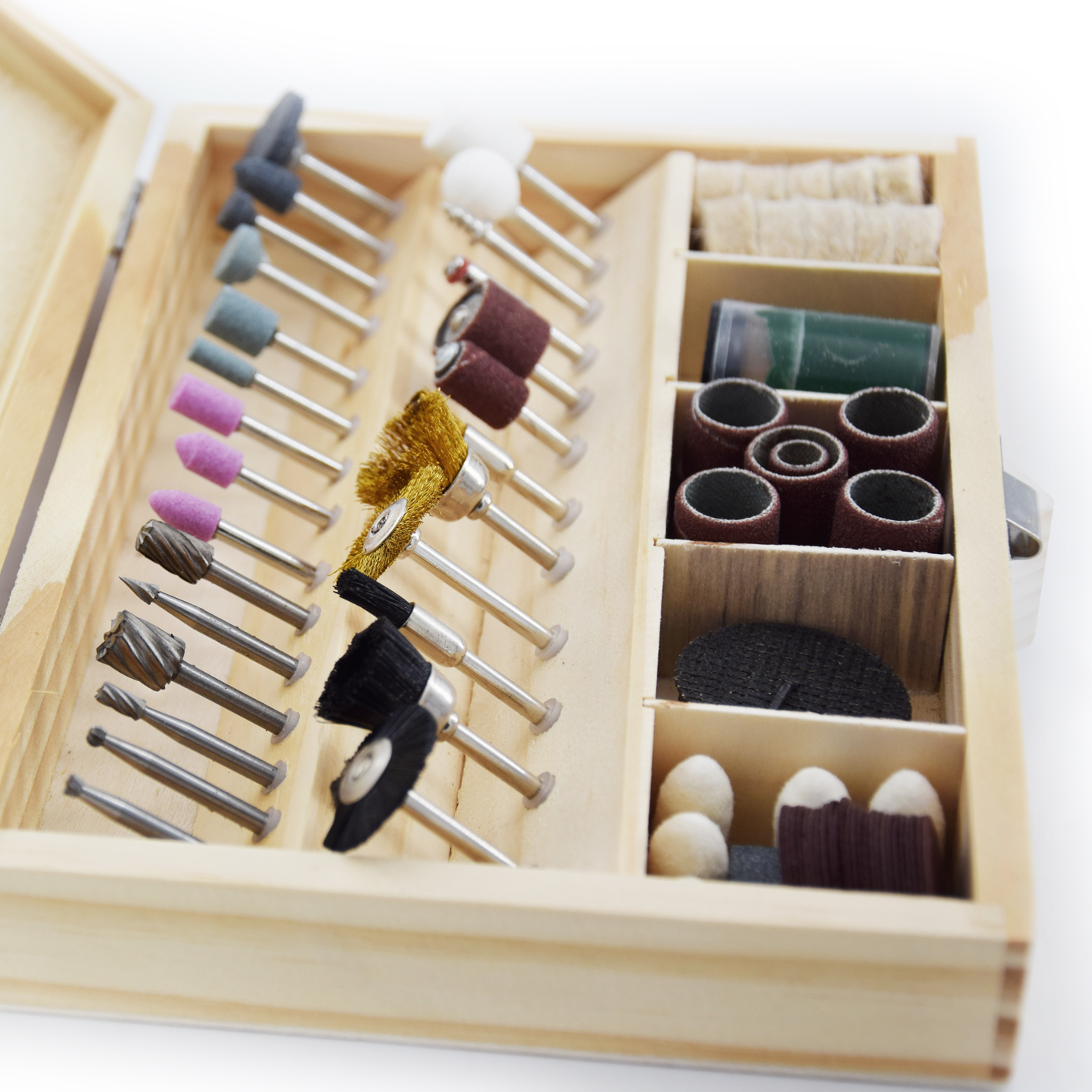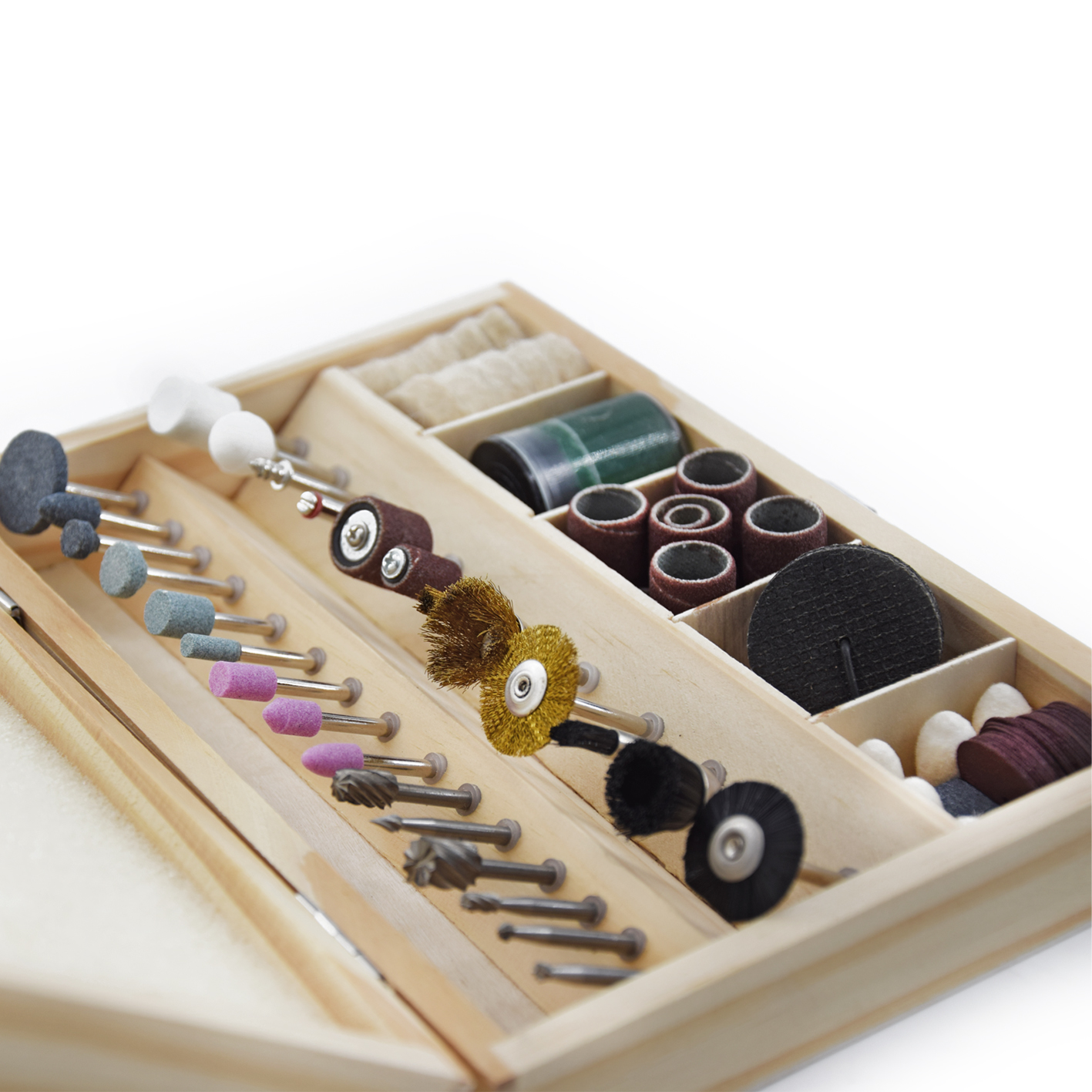 Kompletní 103dílná sada nářadí pro lupínkovou pilu DEK-1600V. Obsahuje různé nástavce pro broušení, leštění, frézování a další práce. Celá sada je přehledně uložena v praktické dřevěné krabičce.