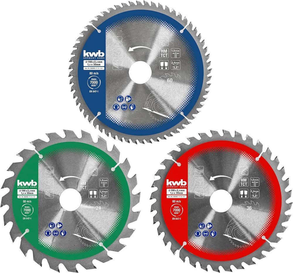 Sada (3 ks ) pilových kotoučů se skládá ze tří barevně odlišených pilových kotoučů vybavených tvrdokovovými zuby (modrý = jemný, červený = střední, zelený = hrubý) pro všechny běžné ruční kotoučové pily o průměru 190 mm x 30 mm.