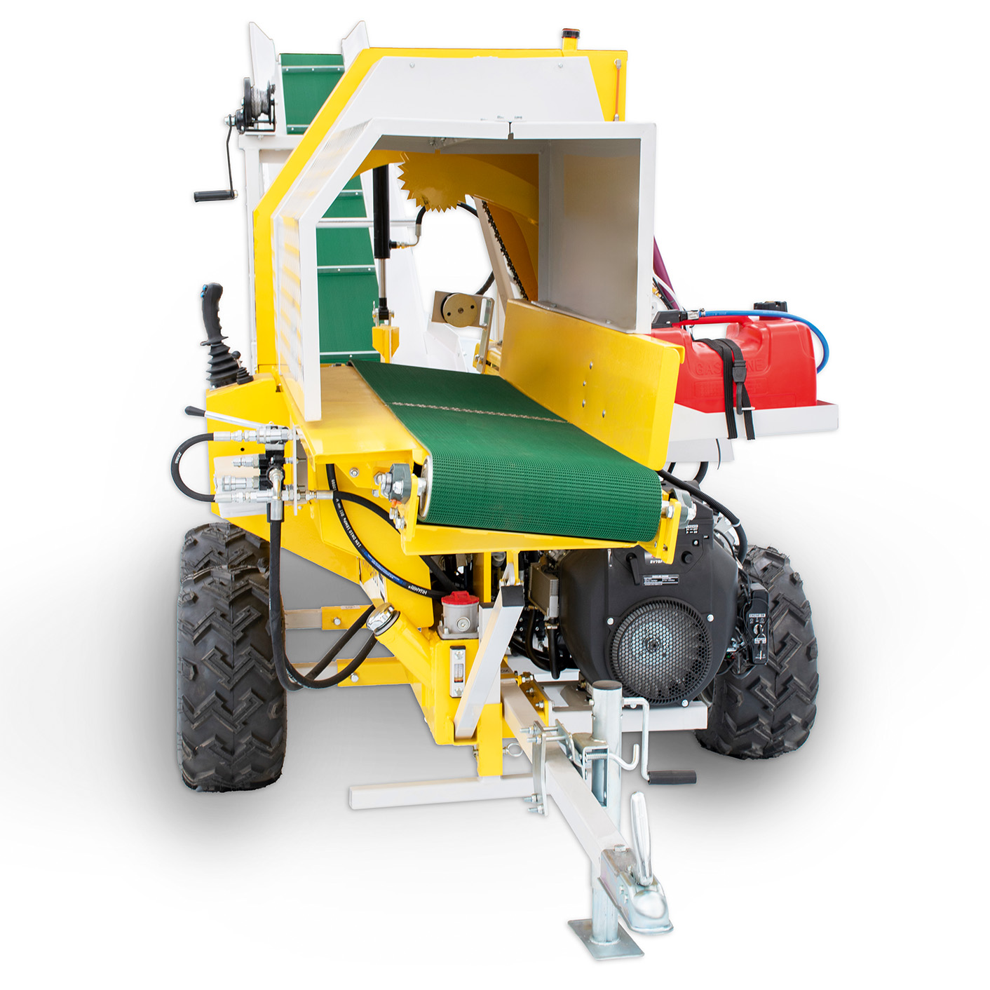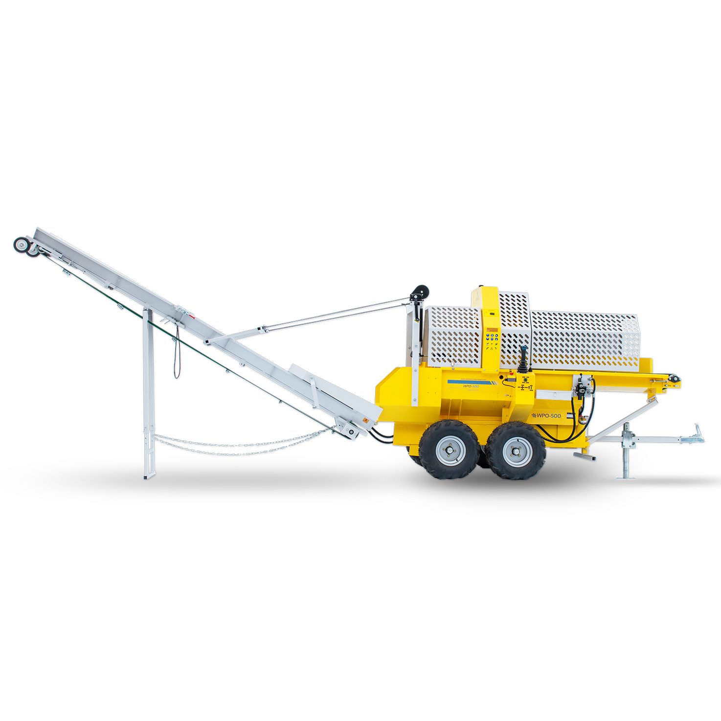 Podávání kmenů je řešeno hydraulicky ovládaným podávacím pásem a volitelně dostupným hydraulickým podavačem WPO-500SZ. Velkou předností je dodávaný 6násobný štípací kříž s hydraulickým nastavením výšky, díky němuž lze na stisk tlačítka pohodlně přizpůsobit štípání různým průměrům polen. Hydraulická řetězová pila je rovněž ovládána joystickem a umožňuje rychlé a efektivní řezy. Díky ATV dvojitému obutí je WPO-500 vhodný i pro náročný terén.
