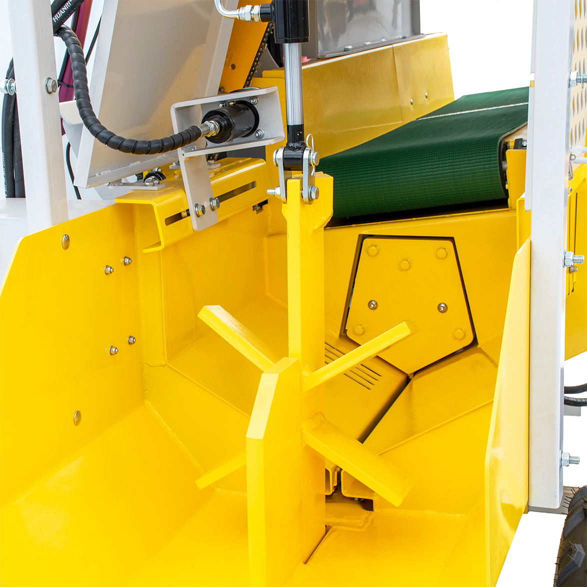 BAMATO 30t štípací a řezací automat WPO-500 s joystickovým ovládáním a dopravním pásem je ideální stroj pro efektivní štípání a zpracování kmenového dřeva. Díky štípací síle 30 tun zvládne bez problémů i velmi silná polena. Joystickové ovládání zajišťuje přesné a jednoduché ovládání, zatímco výškově nastavitelné dopravní pásy usnadňují automatický transport dřeva. Díky robustní konstrukci a kvalitním materiálům je tento automat spolehlivý a odolný. Výkonný benzinový motor 24 PS s elektrickým startem poskytuje potřebný výkon a zároveň zjednodušuje startování.