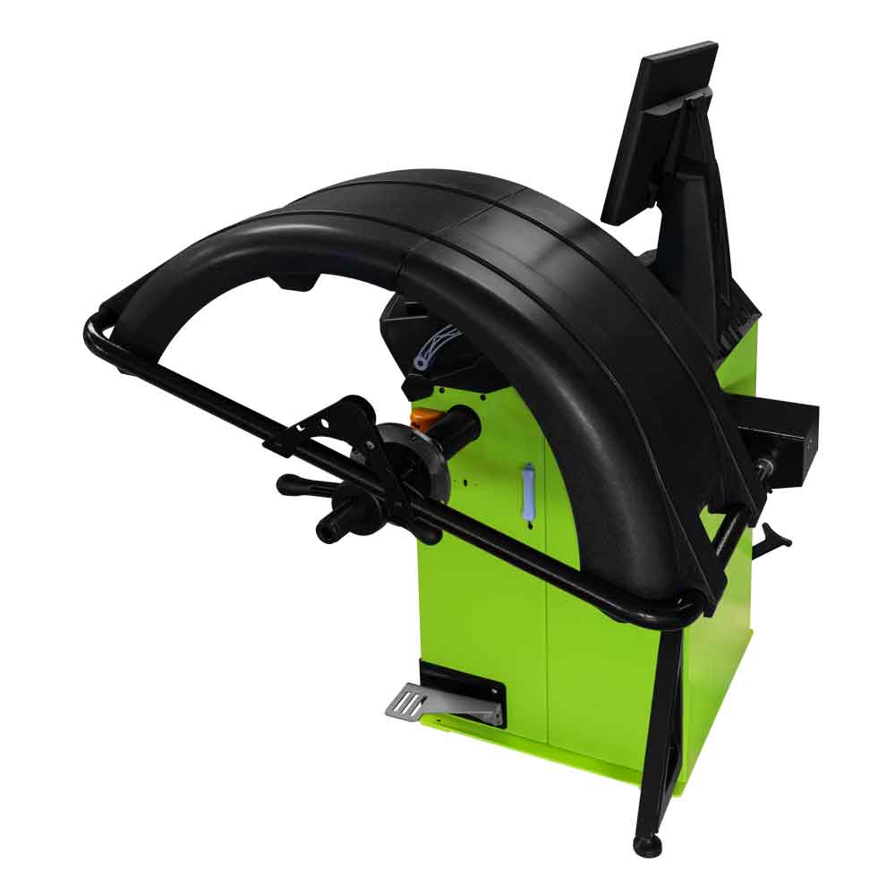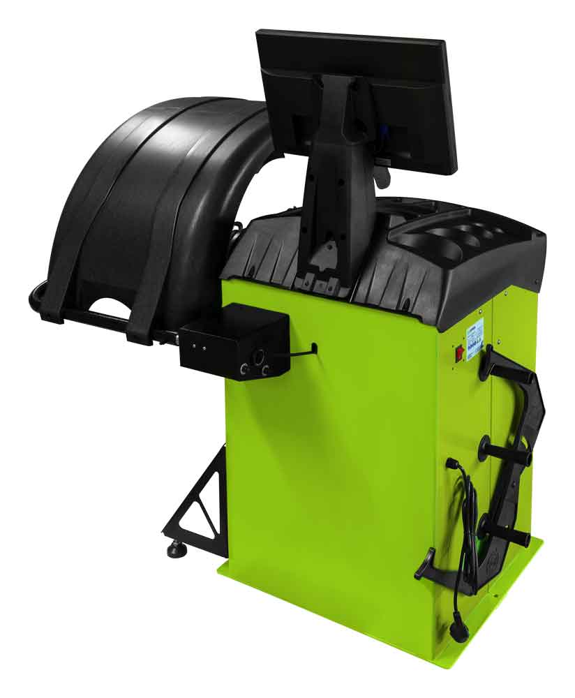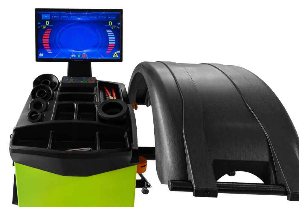 Vyvažovačka kol s ochraným krytem, přehledným ovládacím panelem a LCD displejem, praktickými odkládacími prostory pro vyvažovací závaží/kužely a různé nástroje.